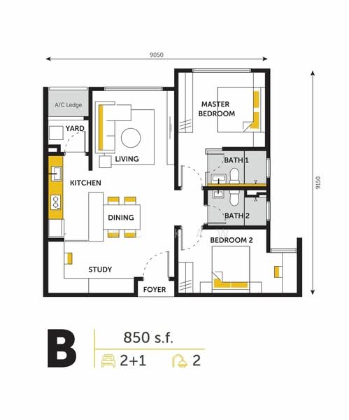 This floor size of this unit is 850 sqft.