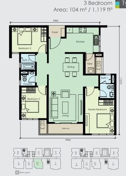 This floor size of this unit is 1,119 sqft.